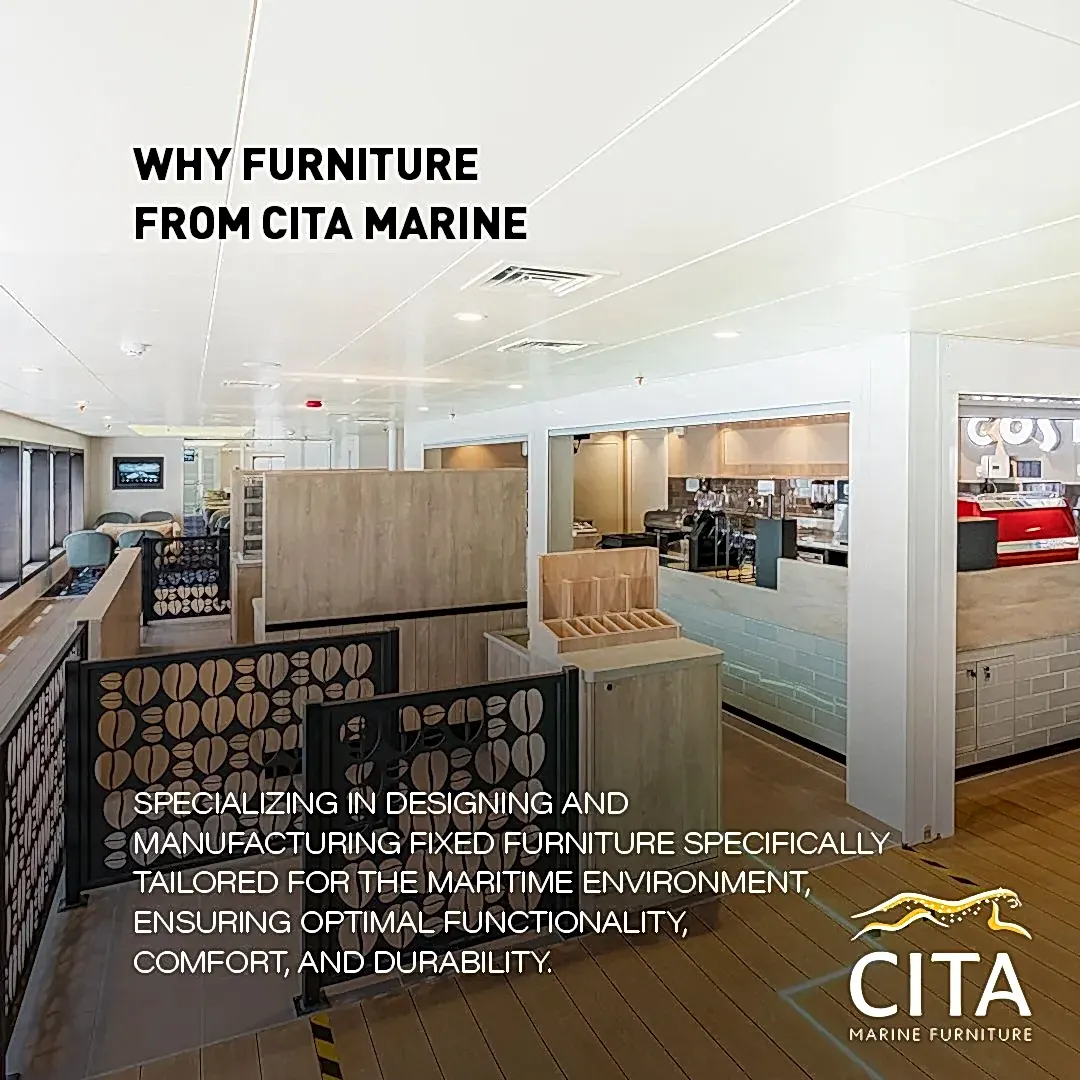 CITA Marine Furniture specializes in the production of IMO-compliant marine furniture that withstands harsh onboard conditions and intensive daily use. Every detail, from materials to finishes, is selected with durability, safety, and functionality in mind.